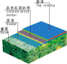环氧彩砂是以彩色石英砂和组成的无缝一体化的新型复合装饰地坪,通过一种或多种不同颜色的彩色石英砂自由搭配,形成丰富多彩的装饰色彩及图案,具有装饰质感优雅,耐磨损、耐抗压、耐化学腐蚀、防滑、防火、防水等优点。彩砂环氧树脂装饰地坪性能稳定可靠,装饰效果更加美观,使用范围更加广泛,可应用于工业地坪、商业及民用建筑地面,近年来在欧美等发达国家十分流行,被誉为“彩砂无缝硬地毯”